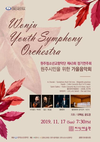 원주청소년교향악단 제43회 정기연주회 ‘원주시민을 위한 가을 음악회’가 오는 17일 오후 7시 30분 치악예술관에서 열린다.