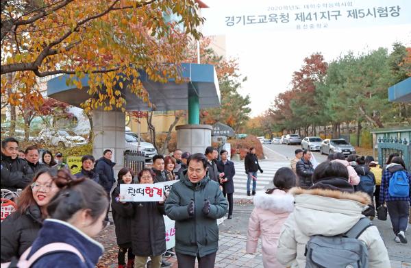 백군기 용인시장은 14일 처인구 역북동 용신중학교 앞에서 2020학년도 대학수학능력시험장에 들어서는 수험생들을 격려했다.