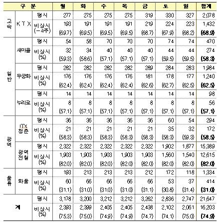 먼저, 고속버스 탑승률은 약 56%로 일평균 여유 좌석이 약 9.3만석, 시외버스 탑승률은 약 47%로 63만석의 여유가 있어 열차 운행 취소로 인한 대체수요를 상당부분 감당할 수 있으며 대체수요가 여유좌석을 초과하는 경우 전국고속버스조합에서 예비버스와 전세버스를 투입해 3.9만석을 추가로 확보할 계획이라고 전했다.