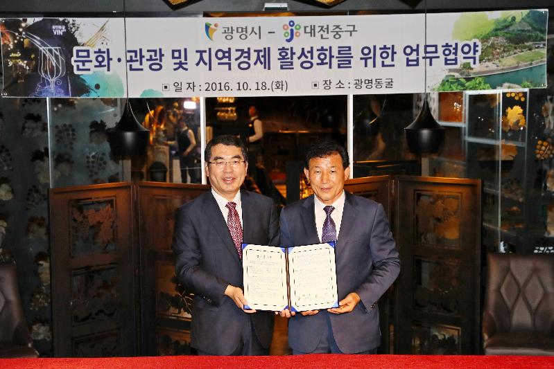 | 18일 양기대 광명시장과 박용갑 대전 중구청장이 대전 장류를 광명동굴에서 판매하기로 하고 관광 상품 및 마케팅을 위한 협약 체결 후 관계자들과 기념촬영을 하고있다. ⓒ광명시청 제공 |
