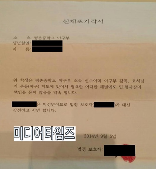 -야구부 학부모들이 미성년자 자녀 대신해 '신체포기 각서' 작성해 물의