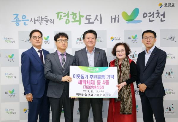 지난 14일 백학산업단지 기업인협의회은 군수실을 방문해 관내 어려운 이웃에게 전달해 달라며 세탁세제 등 4종의 생필품 181상자를 연천군에 전달했다.