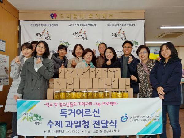 구리시에서는 지난 14일 구리시청소년지원센터 꿈드림의 학교 밖 청소년들이 관내 독거노인 50명에게 직접 담근 수제청을 전달하는 행사를 진행했다.
