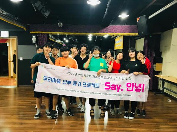 ‘Say, 안녕’은 여성가족부가 주최하고 한국청소년활동진흥원이 주관하는 2019년 여성가족부 청소년프로그램 공모사업으로 선정되어 지난 4월부터 11월까지 약 7개월 간 또래 청소년과 지역주민을 대상으로 마을인터뷰 및 캠페인 등 지역사회와 사회구성원의 변화 및 관계개선을 도모하기 위한 다양한 활동을 진행했다.