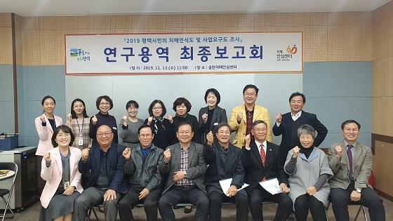 이종호 평택시 부시장은 “이번 치매인식도 및 사업요구도 조사 연구 결과를 사업계획 수립에 적극 반영해 지역특성에 맞는 수용자 중심의 치매관리사업 추진으로 치매안심평택을 만들어 나가겠다”고 말했다.