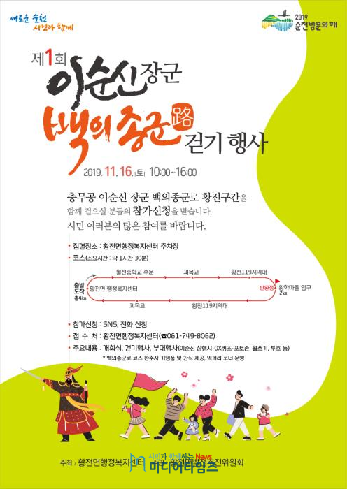 황전면 관계자는 “걷기코스 중심의 미래형 관광트렌드 변화에 대비해 백의종군로를 연간사업으로 발전시켜 황전면의 관광 인프라 구축과 이를 자원화하는데 주력하고 있다.”며 “내년부터는 더 많은 순천시민이 참여할 수 있도록 규모를 확대해 명실상부한 역사탐방 프로그램으로 운영해나갈 방침”이라고 의지를 밝혔다.