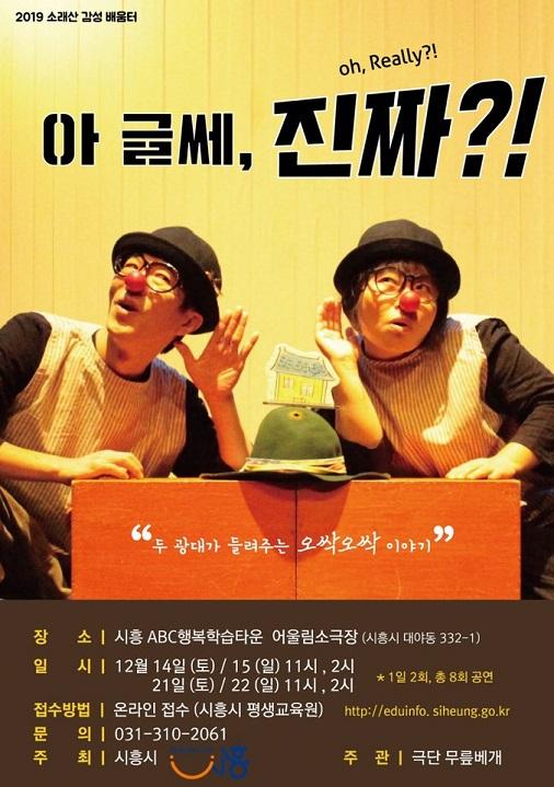 시흥시는 오는 12월 14일 15일 21일 22일 4일 동안 총 8회에 걸쳐 시흥ABC행복학습타운 어울림소극장에서 연극 ‘아 글쎄, 진짜?’ 공연을 개최한다.