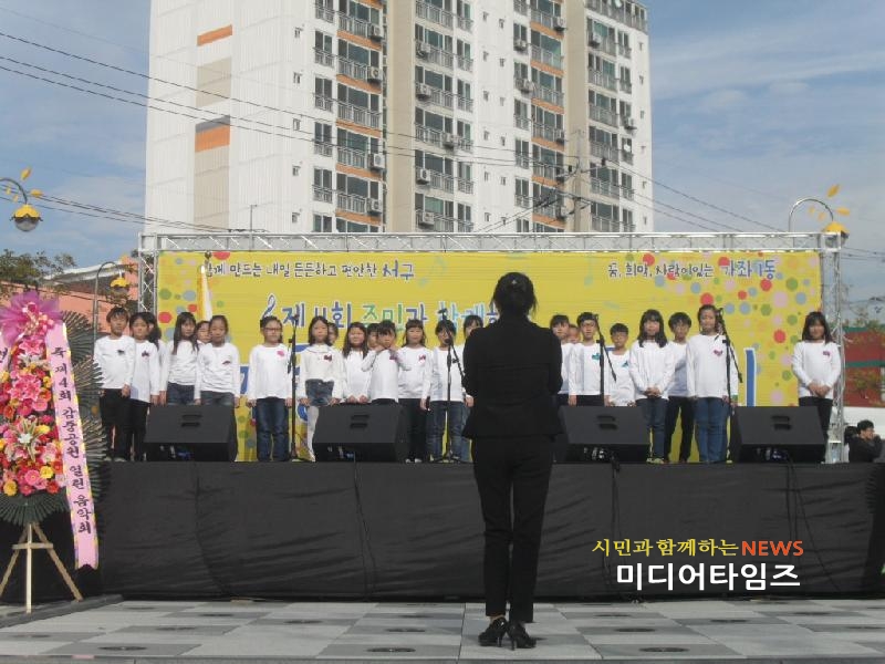 [미디어타임즈=문상수 기자]인천 서구 가좌1동 주민자치위원회(위원장 한명수)는 지난 10월 22일 감중공원에서 주민들과 함께 참여하며 즐기는 주민어울림 한마당축제인 “제4회 감중공원 열린음악회”를 개최하였다. 이 날 행사에는 가좌1동 자생단체들의 적극적인 참여로 인해 진행되었으며, 강범석 구청장님을 비롯하여 시·구의원님 등 많은 내빈들과 주민 500여명이 참석하였다. 이번 열린 음악회는 가좌1동 주민자치센터에서 운영하고 있는 문화교실 프로그램 수강생들이 주민들에게 그동안 갈고닦은 실력을 선보여 멋진 공연의 장을 열었으며 프로그램 홍보에도 많은 기여를 하였다. 또한 봉화감중무지개합창단, 봉화초 사물놀이패 등 관내 어린이들이 이번 행사를 위해 열심히 준비한 공연을 밝고 예쁜 모습과 함께 선보여 주민들의 많은 갈채를 받았다. 지역주민들의 호응으로 인해 이번 열린음악회는 성황리에 마쳤으며 주민과 함께하는 가좌1동의 흥겨운 문화축제로써 앞으로도 지속적으로 열릴 예정이다.