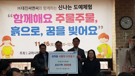 파주시 교하동 사회보장협의체와 ㈜대진씨앤씨 임직원봉사단은 지난 16일 오도동에 위치한 ‘토루공방’에서 교하동 관내 저소득층 아동 15명을 초청해 문화체험 멘토링 봉사활동을 펼쳤다.