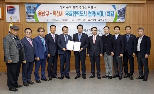 익산시는 18일 시청에서 정헌율 시장과 조규대 시의장, 성장현 용산구청장, 장정호 용산구의회 부의장 등이 참석한 가운데 양 도시 간 상호교류와 협력을 위한‘우호협력도시 MOU’를 체결했다.