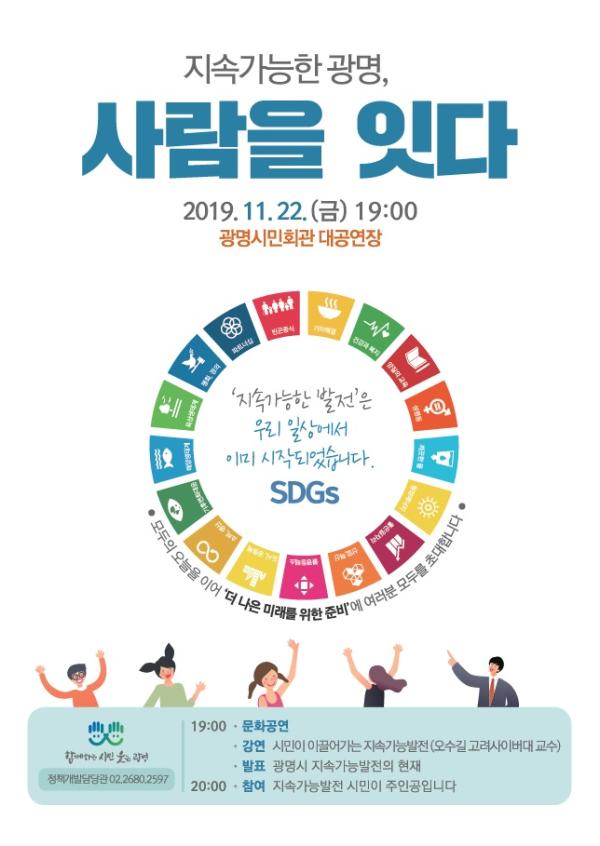 이날 행사에서는 오수길 고려사이버대 교수의 강연과 광명시 지속가능발전 추진상황에 대한 발표가 진행되며 마지막 순서에서는 각 분야별 시민대표의 다짐과 포부를 듣는 시간이 마련된다. 또 국가지속가능발전 17개 목표를 나타내는 카드섹션과 청소년 댄스동아리 폴라리스, 시민 오케스트라의 공연이 어우러져 시민의 축제가 될 전망이다.