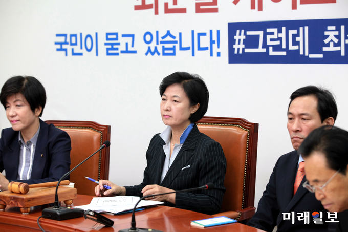 추미애 민주당 대표는 이날 국회에서 열린 당 최고위원회 회의에서 "여전히 문제 핵심인사들이 큰소리를 치면서 국정을 쥐고 있다"며 "국정의 맥을 쥐고 있는 우병우 민정수석이 책임감 운운하며 청와대 비서진의 사퇴를 가로막고 허수아비 총리가 장관 모아 회의를 갖고 있다"고 말했다.