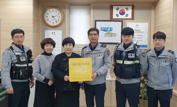 수원시 장안구치매안심센터가 창룡문 지구대를 ‘치매극복 선도기관’으로 지정하고 18일 현판을 전달했다.