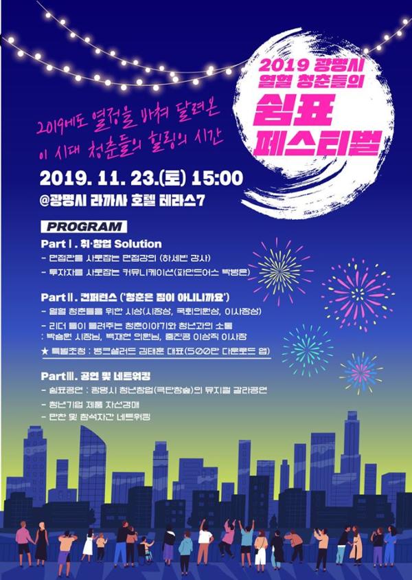 행사 1부에서는 뱅크 샐러드 김태훈 대표의 강연과 ‘리더들이 들려주는 청춘이야기’코너로 박승원 광명시장, 백재현 국회의원, 중소기업진흥공단 창업사관학교장이 자신들의 청춘 이야기를 들려줄 예정이다.