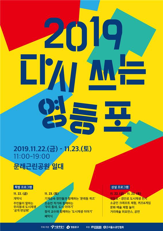서울시는 오는 22일부터 23일까지 서울 영등포구 문래동에 위치한 문래근린공원에서 서남권에서는 처음으로 도시재생 축제 ‘2019 다시 쓰는 영등포’를 개최한다.