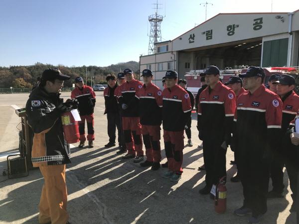 이날 훈련은 격납고 주변 전기합선으로 화재가 발생해 긴급한 화재상황임을 가정한 대처훈련으로 화재발생시 전 직원은 소방대가 도착하기 전까지 소화기 및 옥내소화전을 이용해 초기 화재진압훈련과 응급환자 발생 시 인명구조 등 직장 내 구성된 자위소방대원들의 초기대응능력을 점검하고 향상시키기 위해 실시했다.