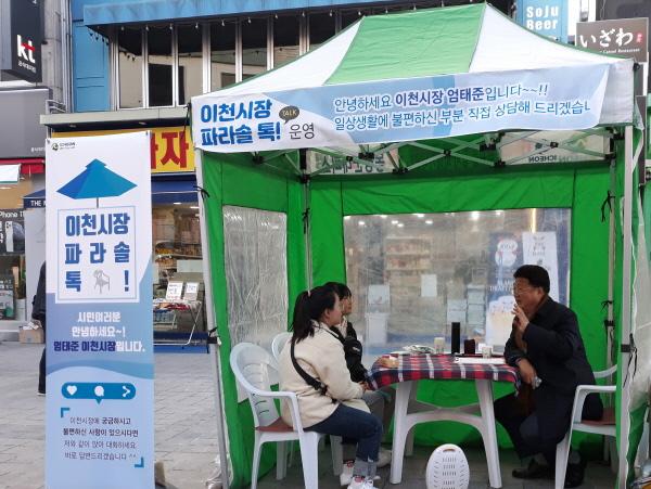 이천시는 지난 14일 중앙통 문화의 거리에서 네 번째 ‘이천시장 파라솔 톡~’을 운영했다.