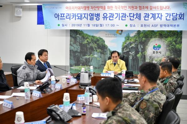 이날 간담회는 박윤국 포천시장을 비롯해 조용춘 포천시의회 의장, 군부대 지휘관 및 실무관, 경찰서 소방서 등 유관기관장, 농협중앙회 포천시지부 등 농업관련기관장, 지역 내 사회단체장, 실무부서 공무원 등 40여명이 참석해 지난 9월 17일 아프리카돼지열병 국내 최초 발생 이후 포천시에서 실시하고 있는 방역대책 추진사항을 보고하고 대책을 논의하는 등 그간의 협조와 지속적인 노력을 당부하는 자리로 마련됐다.