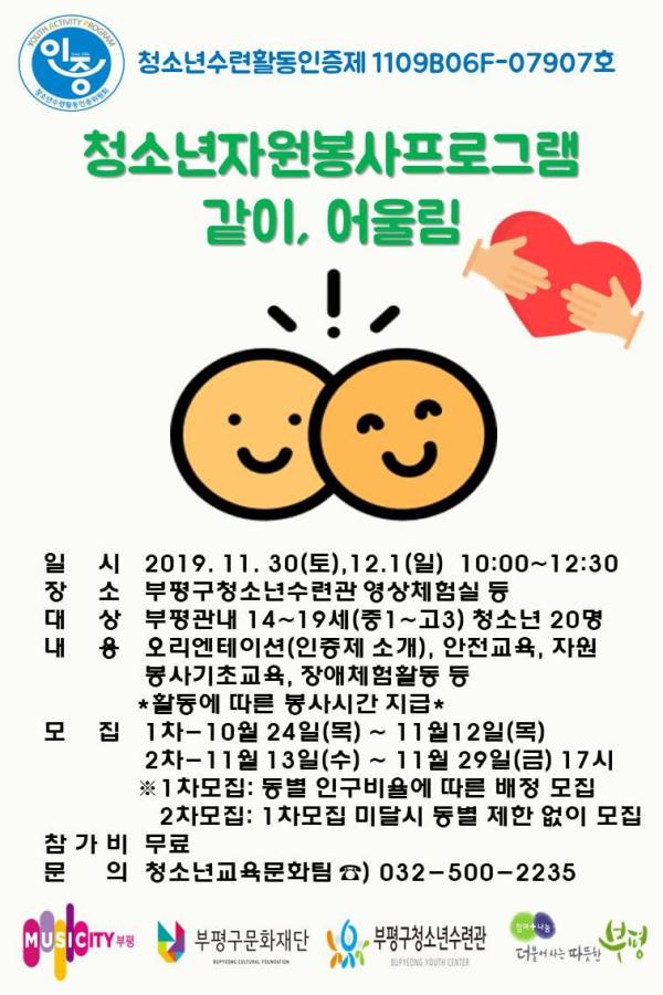 부평구청소년수련관이 오는 30일부터 12월 1일까지 이틀간 진행되는 청소년자원봉사프로그램 ‘같이, 어울림’에 참가할 청소년 20명을 모집한다.