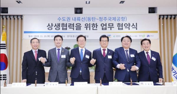 경기도와 충청북도, 안성시, 화성시, 청주시, 진천군은 19일 경기도청에서 수도권 내륙선 철도사업의 상생협력을 위한 업무협약을 체결했다.