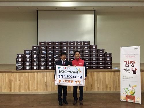 지난 19일 진행된 김장 나눔 행사에는 KGC인삼공사 정관장 사회봉사단 임직원 100여명과 함께 인삼재배 계약농가도 참여해 상생과 나눔의 의미를 더했다.