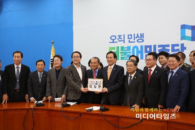 | 경기도시장군수협의회 김윤식 회장(시흥시장)과 공동대표단이 7일 국회 정론관에서 열린 ‘지방재정 확충과 누리과정 해결을 촉구한다’는 기자회견 마치고, 우상호 더불어민주당 원내 대표를 만나 공동 성명서를 전달하고 있다.<ⓒ미디어타임즈> |