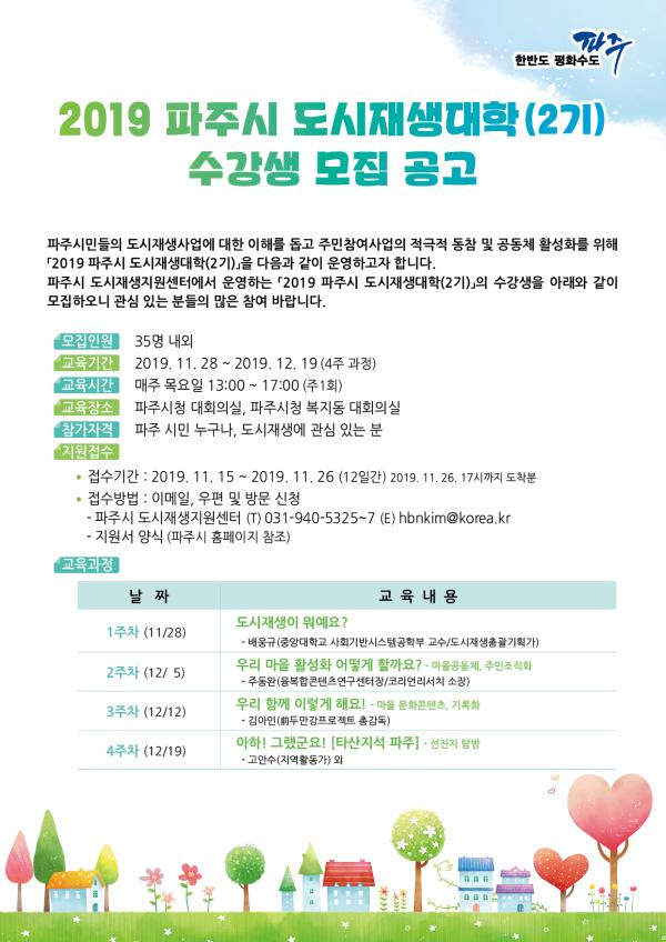 파주시는 도시재생사업 이해를 높이고 주민 중심의 도시재생 역량강화를 위해 ‘2019 파주시 도시재생대학’ 수강생을 오는 26일까지 모집한다.