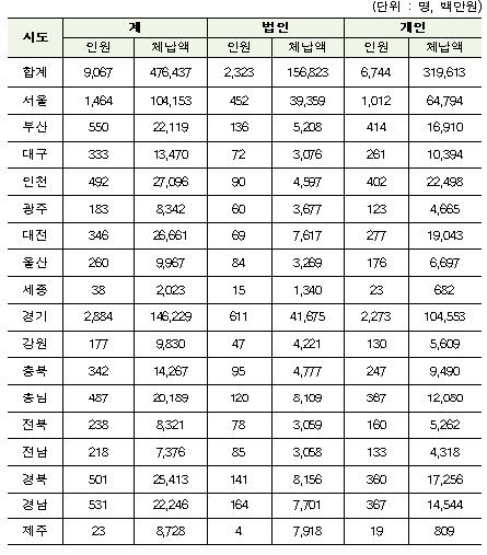 올해 지방세 체납자 명단 공개대상자는 9,067명으로 총 체납액은 4,764억원으로 1인 평균체납액은 5천2백만원이다.