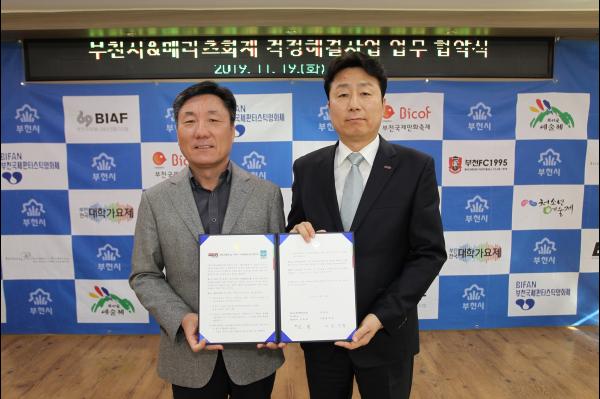 부천시는 지난 19일 시청 만남실에서 메리츠화재와 ‘걱정 해결 사업’ 업무협약을 체결하고 오는 12월부터 2020년 12월까지 민·관 협력으로 복지 사각지대를 발굴·지원하기로 약속했다.