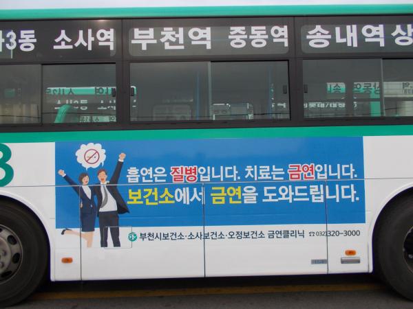 지하철 7호선 부천시청역, 신중동역, 춘의역, 부천종합운동장역, 까치울역 5개소 역사 및 시내버스 13개 노선 총 22대에 광고문을 부착해 금연을 홍보한다.