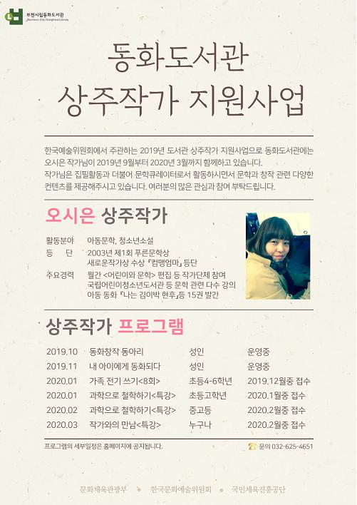 부천 동화도서관은 상주작가인 오시은 작가와 함께하는 다양한 프로그램을 운영 중이다. 오시은 상주작가는 ‘컴맹엄마’로 2003년 제1회 푸른문학상 새로운작가상을 수상하며 등단했으며 집필활동과 더불어 작가단체 활동 참여와 문학창작 관련 강의 등 다양한 분야에서 활동하고 있다.