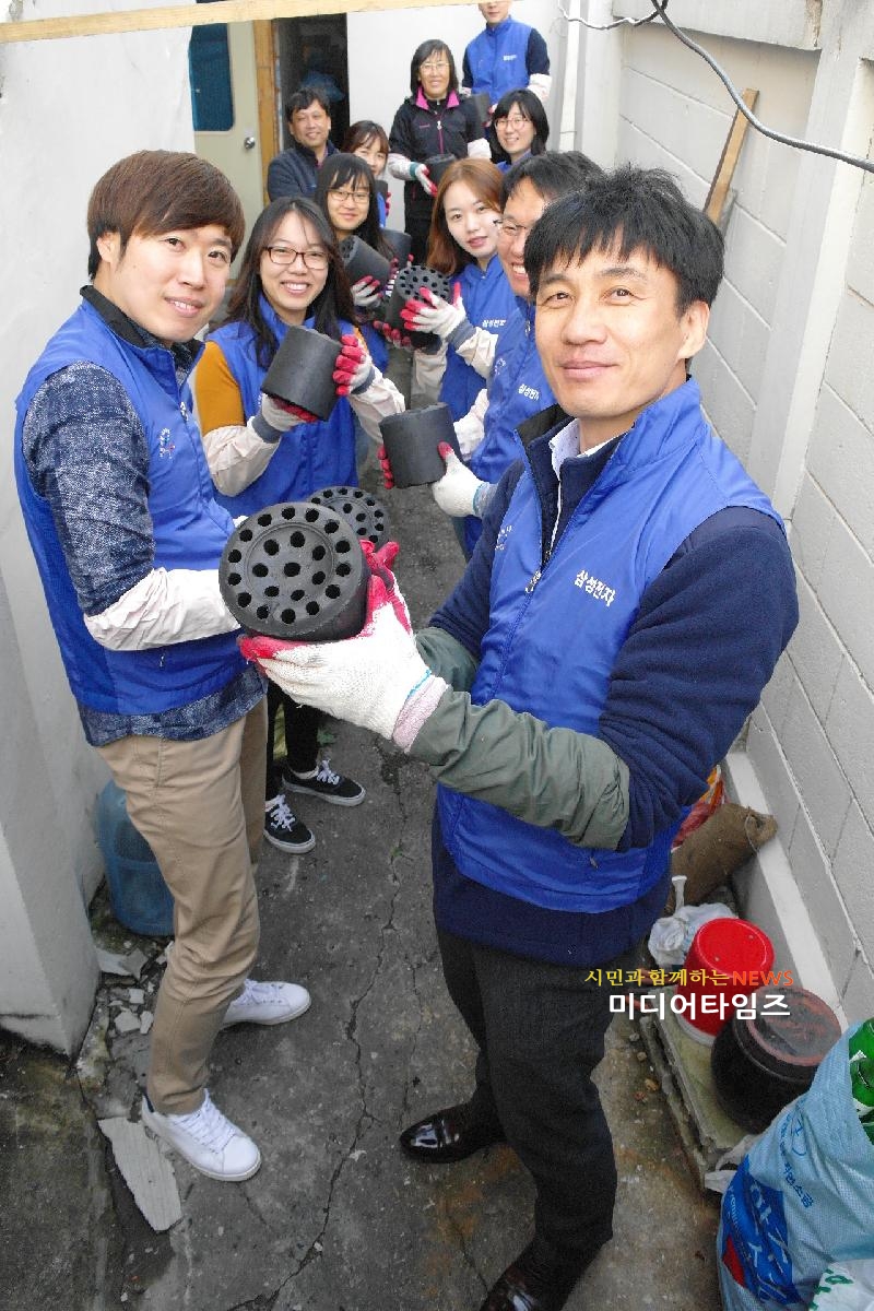 | 지난 3일 오산종합사회복지관과 삼성전자 임직원 자원봉사자가 연탄을 전달하고 있는 모습. <ⓒ미디어타임즈> |