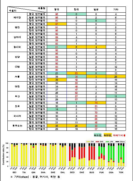 2017년을 대상으로 대기질 모델 기법을 이용해 초미세먼지에 대한 3국 주요도시의 국내외 영향을 분석한 결과, 자체 기여율은 연평균 기준으로 한국 51%, 중국 91%, 일본 55%로 나타났다.