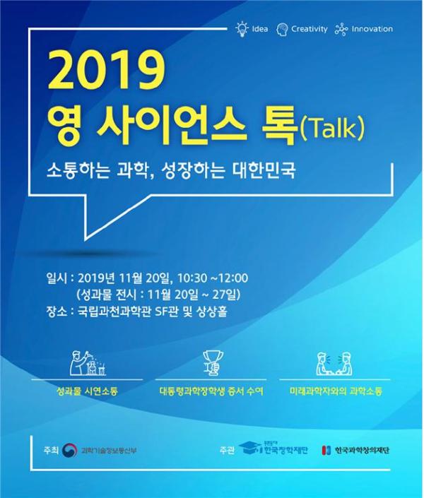 과학기술정보통신부는 대통령 과학장학생, 국제과학올림피아드 한국대표단, 전국 과학대회 입상자 등 130여명과의 과학소통과 격려를 위한 ‘2019 영 사이언스 톡’을 20일 오전, 국립과천과학관에서 개최했다.