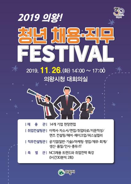 의왕시는 청년들에게 다양한 고용 정보와 취업 기회를 제공하기 위해 오는 26일 시청 대회의실에서 2019 의왕‘청년 채용·직무 페스티벌’을 개최한다.