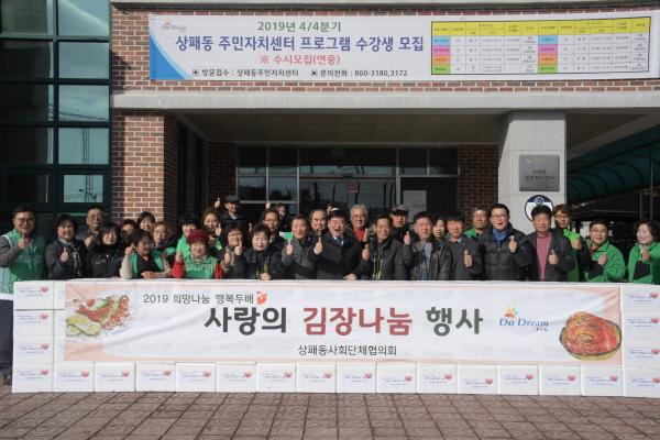 진영호 상패동장은 “올해도 어김없이 우리 이웃을 위해 김장김치 나눔행사를 후원해주시고 참여해주신 사회단체장님들, 새마을지도자, 새마을부녀회, 통장협의회 회원 분들께 감사의 말씀을 드리며 김장김치 나눔행사로 우리 상패동 지역주민들이 조금이나마 행복하셨으면 좋겠다”고 전했다.