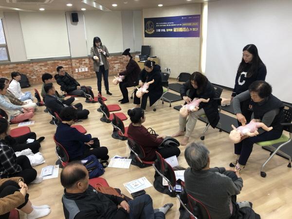 2부는 응급구조사 2명이 자동심장충격기 사용 및 심폐소생술 방법 등의 이론 교육과 교육용 마네킹을 활용한 실습 교육을 진행했다.