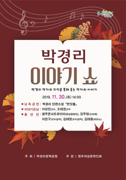 박경리문학공원이 주최하고 원주여성문학인회가 주관하는 ‘박경리 이야기쇼’가 오는 30일 오후 2시 박경리문학공원에서 개최된다.