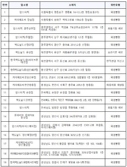 식품의약품안전처는 최근 일부 햄버거 프랜차이즈 업체의 위생상태가 불량하다는 언론보도 등과 관련해 지난 1일부터 15일까지 전국의 주요 햄버거 프랜차이즈 매장 147곳을 점검한 결과, ‘식품위생법’을 위반한 19곳을 적발했다.