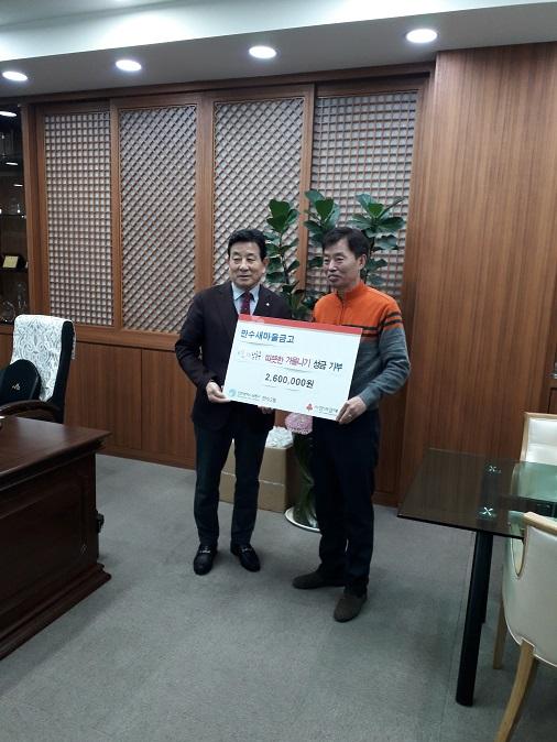 지난 20일 남동구 만수새마을금고은 동절기 저소득가정 아동 난방비 지원을 위해 만수2동 행정복지센터를 포함해 만수새마을금고에서 관할하는 8개동에 총 260만원을 기부했다.
