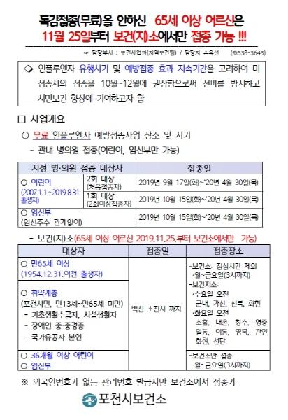 포천시는 장시간 대기로 인한 불편함, 안전사고 우려 등을 고려해 보건소에서만 가능했던 인플루엔자 무료 예방접종을 민간위탁의료기관에서도 확대 실시하고 있다.