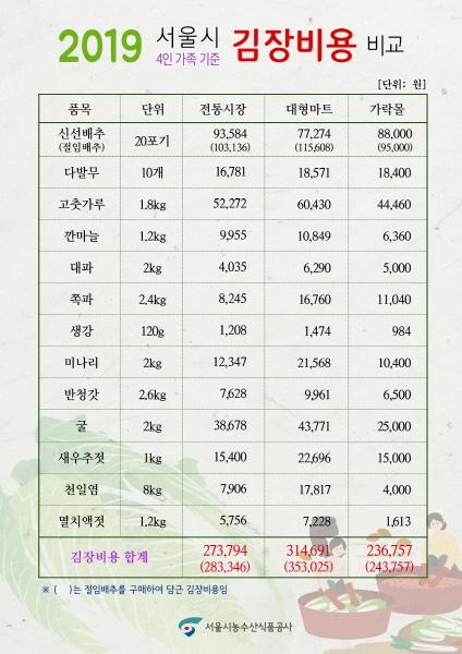 서울시농수산식품공사는 김장 성수기를 앞두고 서울 시민에게 유익한 정보를 제공하고 친지·이웃과 정을 나누는 김장 문화 확산을 위해 서울시 25개 자치구 내 전통시장, 대형마트 및 가락시장 내 가락몰 등 총 76곳을 대상으로 4인 가족 김장 비용을 조사·발표했다.