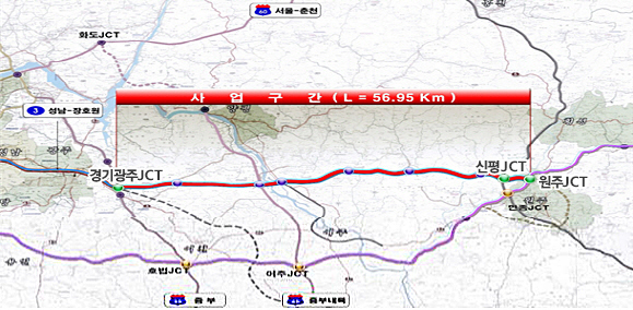 광주~원주 고속도로는 경기도 광주에서 강원도 원주를 연결하는 57km, 왕복 4차선 도로로 약 1조 6000억 원의 사업비가 투입됐다.