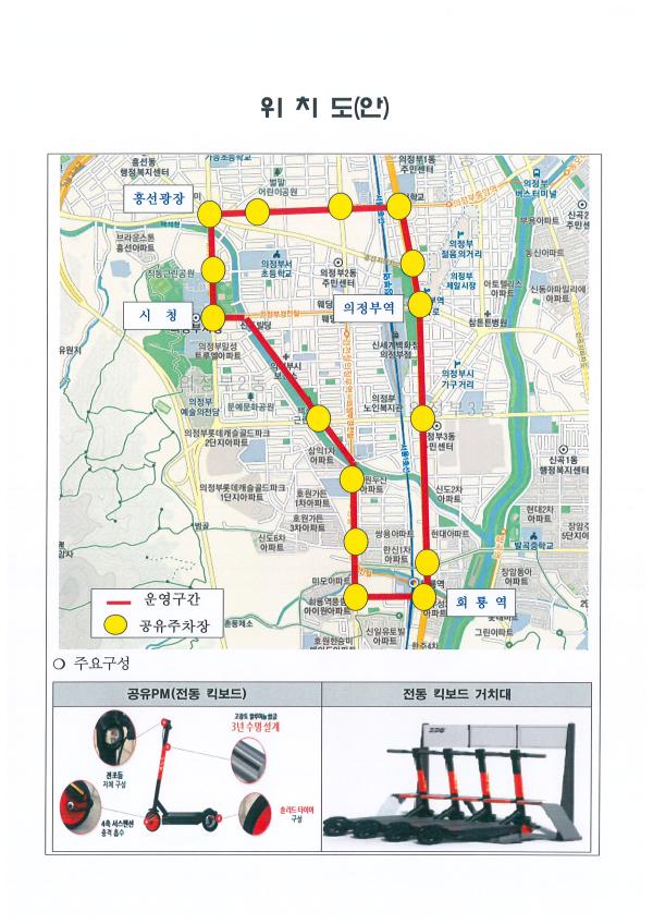 시는 회룡역~의정부역~시청을 경유하고 아파트 밀집지, 경전철 역사, 학교 등 인구밀집지역을 연계하는 플랫폼 15개소를 두고 킥보드 100여 대를 운용해 주민들에게 교통편익을 제공할 계획이라고 전했다.