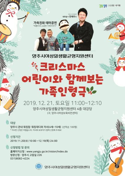 ‘크리스마스 어린이와 함께 보는 가족인형극-메롱이의 소중한 가족이야기’는 12월 21일 여성일·생활균형지원센터 4층 다목적실에서 진행하며 가족의 소중함을 일깨우고 사랑을 실천하는 가족친화 인형극을 복화술의 대가인 극단친구 안재우 소장이 공연할 예정이다. 참가를 원하는 사람은 다음달 19일까지 선착순으로 홈페이지 또는 방문 접수하면 된다.