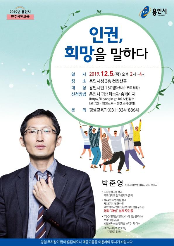 용인시는 시민 스스로 인권을 지키고 민주시민의식을 갖추도록 여는 박준영 변호사의 ‘인권’ 강연 참여자 150명을 선착순 모집한다.