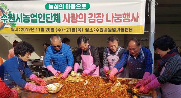 21일 권선구 수원시농업기술센터에서 열린 ‘사랑의 김장 나눔 행사’에 참여한 수원시 농업인단체 임원들이 김치를 담그고 있다. 수원시농촌지도자회 등 10개 농업인 단체 회원들은 직접 재배한 농산물로 김장을 해 김치 700㎏을 관내 사회복지시설 10개소에 전달했다.