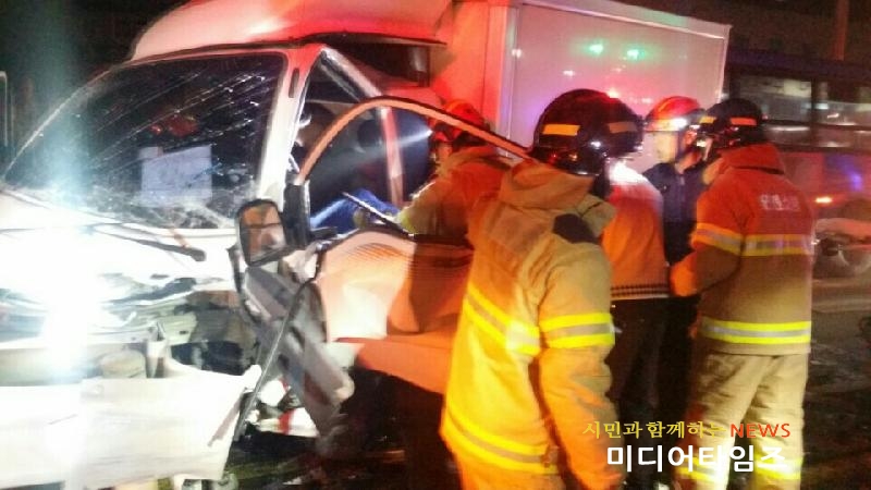 [미디어타임즈=문상수 기자] 서부소방서(서장 김준태)는 지난 14일 새벽 6시경 안동포사거리에서 검단산업단지 방향 일반도로에서 화물트럭이 중앙 가드레일을 충돌하여 부상자 2명이 발생했다고 밝혔다.당시 부상자들은 두 다리가 차체에 끼어 있는 상태로 발목에 심한 골절상 관찰. 119구조대원이 유압펌프 및 전개기를 사용하여 구조 및 응급처치 하였다. 구조된 남성운전자는 양측 다리 골절로 이송되어 치료를 받는 중이며, 또한 보조석에 탑승한 여성분은 안면부에 찰과상, 눈에 타박상 관찰 및 치아통증을호소하여 신속히 병원으로 이송되어 치료를 받는 중이고, 정확한 사고원인은현재 경찰 조사중이이며 다행히 신속한 인명구조 및 응급처치로 생명에 이상은 없는 것으로 확인됐다.