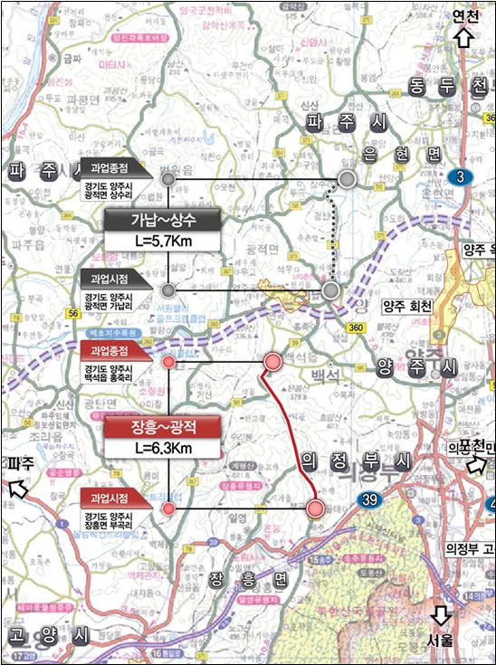 ‘국지도 39호선 확·포장공사’는 총 사업비 914억원을 투입해 양주시 장흥면 부곡리에서 백석읍 홍죽리까지 6.3km 구간을 왕복 2차로로 개량하는 사업이다.