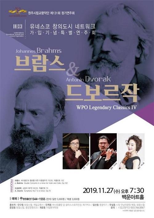유네스코 문학창의도시 네트워크 가입을 기념하는 원주시립교향악단 제131회 정기연주회 ‘브람스&드보르작’이 11월 27일 오후 7시 30분 백운아트홀에서 김광현 상임지휘자의 지휘로 열린다.